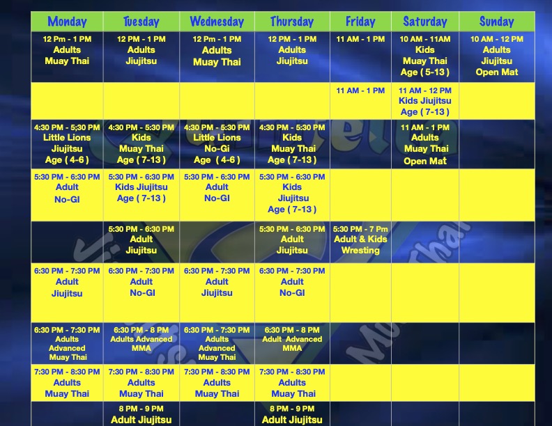 We offer a variety of martial arts disciplines, including Muay Thai, Brazilian Jiu-Jitsu, Karate, and Taekwondo. Each class is designed to cater to different skill levels and fitness goals.